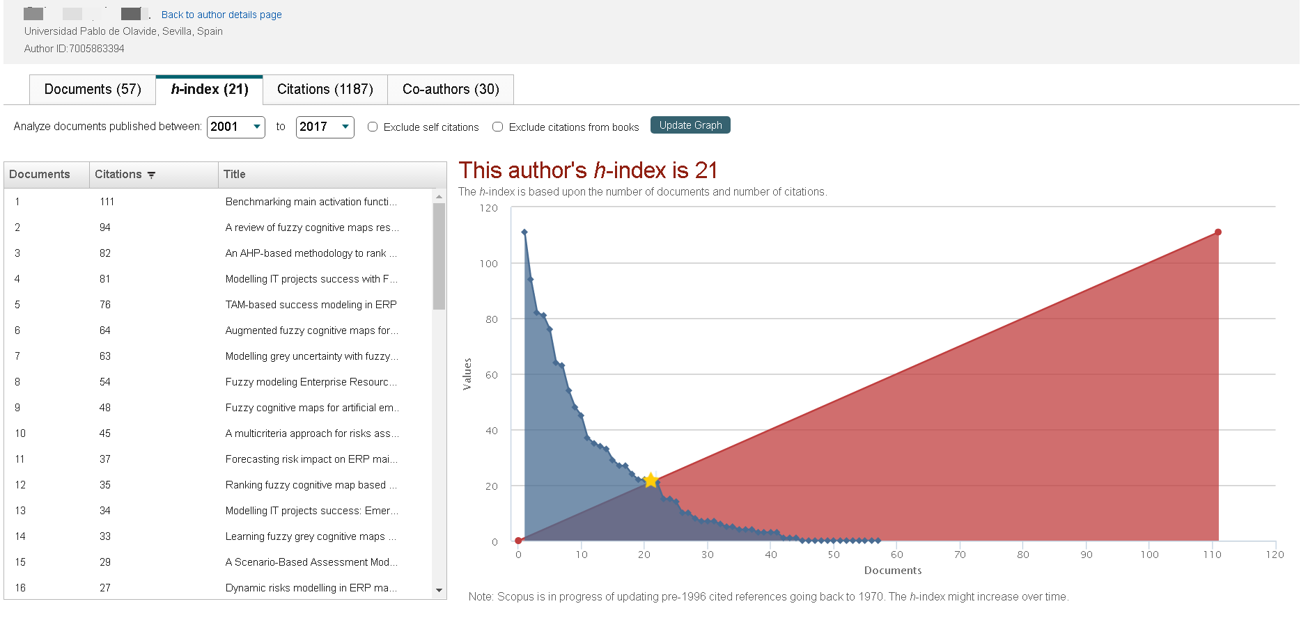 El índice H de Hirsch es un indicador que permite evaluar la producción científica de un investigador. Este gráfico es una de las mediciones que proporciona el análisis de autoría, denominado Analyze author output